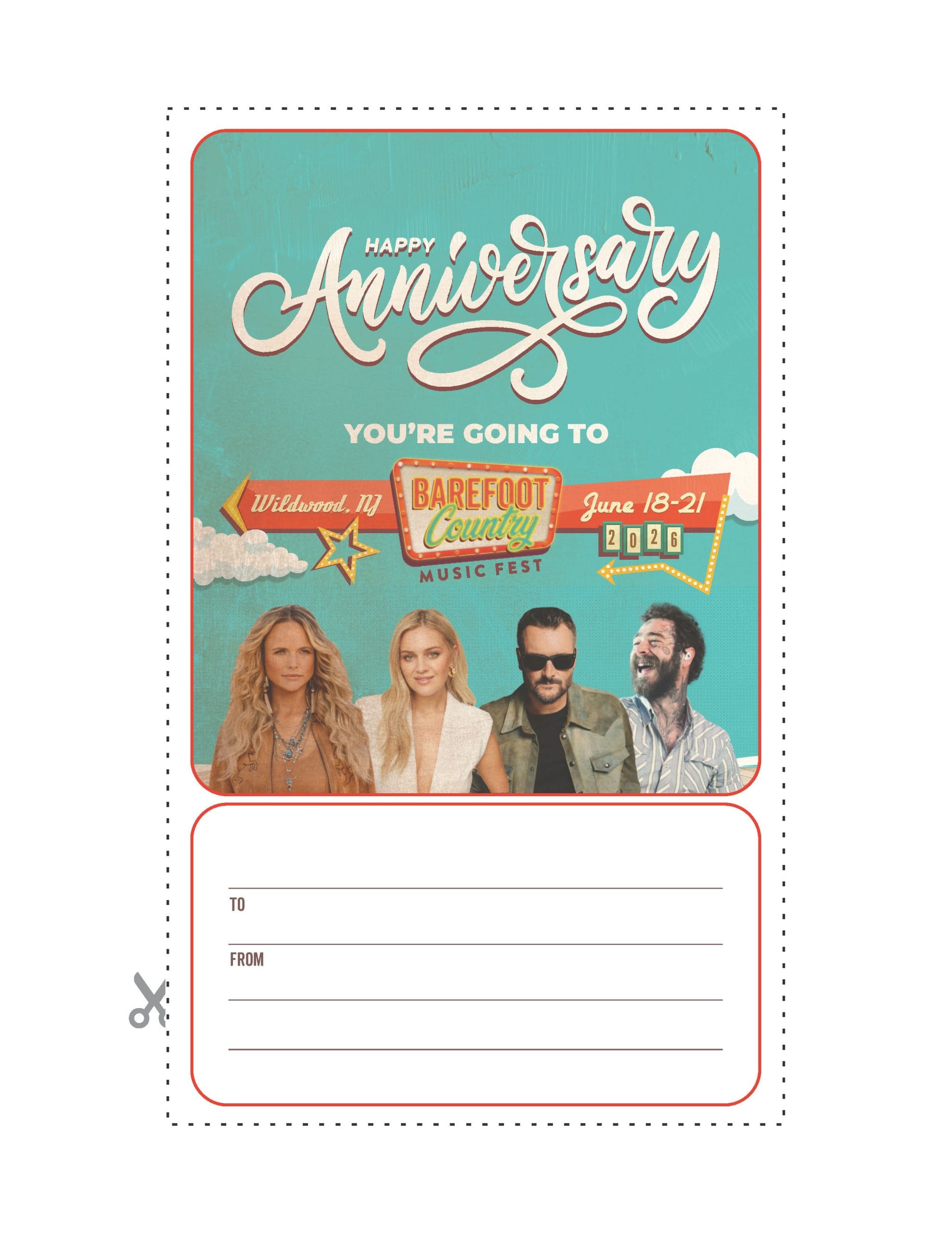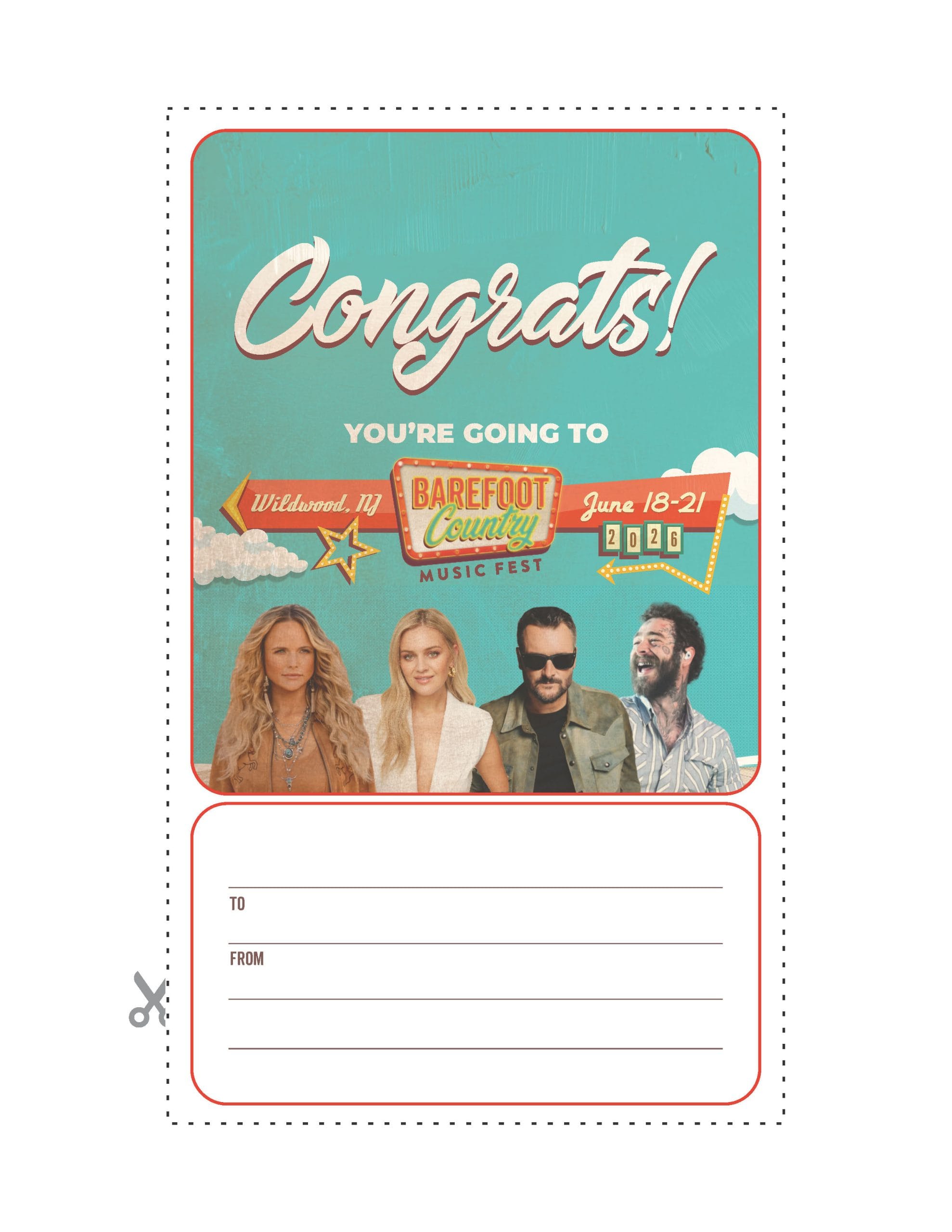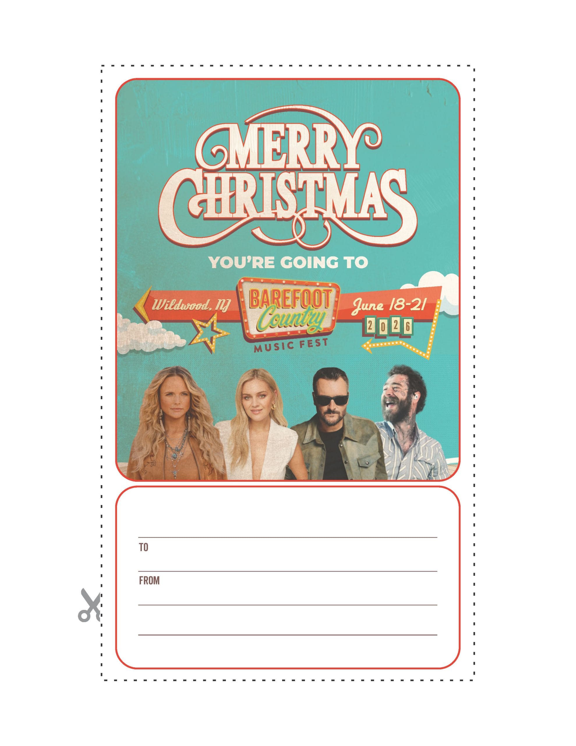 Giving the ultimate gift of Barefoot Country Music Fest® this year? Looking for something with a little more “wow” than a email receipt? We got you covered! Use the official BCMF Gift Voucher to add some fun to your gift giving. Just print it out, wrap it up, and give it to that special someone!