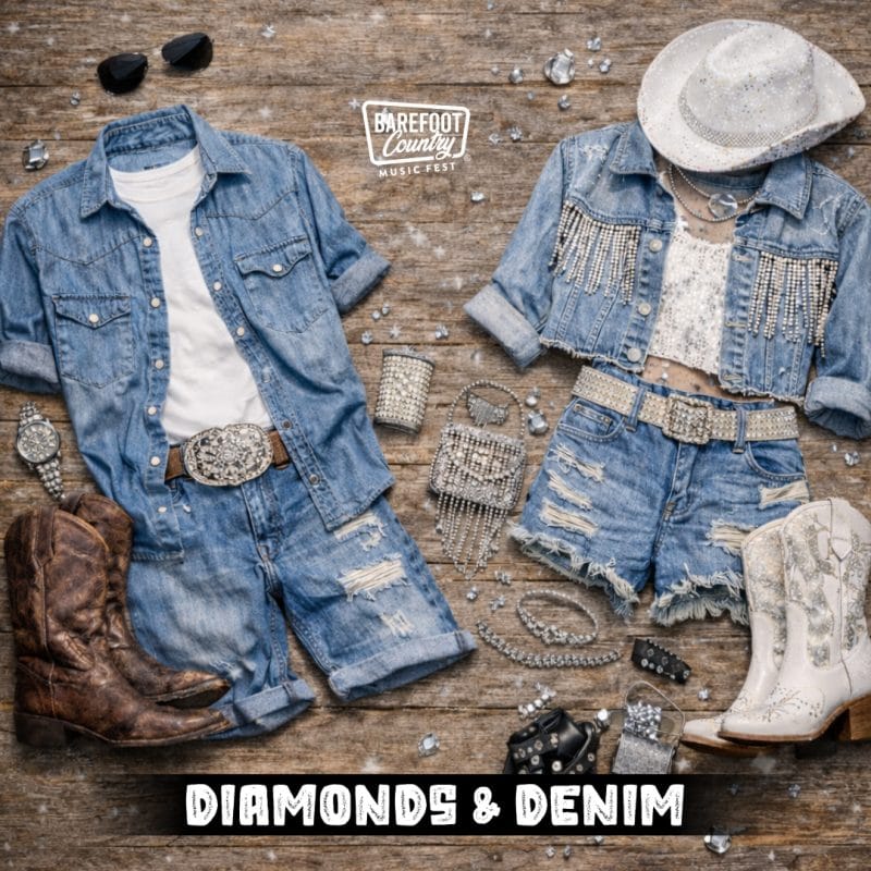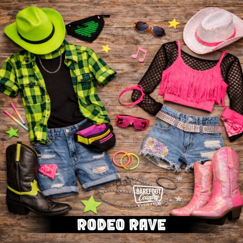 The Guys’ Look: Go western with an edge: sleeveless denim or graphic tees, open button-downs, or a modern cowboy look paired with bold accessories. Neon bandanas, or LED hats, take it straight into rave territory. Pull out your jorts or jeans, keep it classic, while lighter washes or distressed styles give that laid-back beach feel.