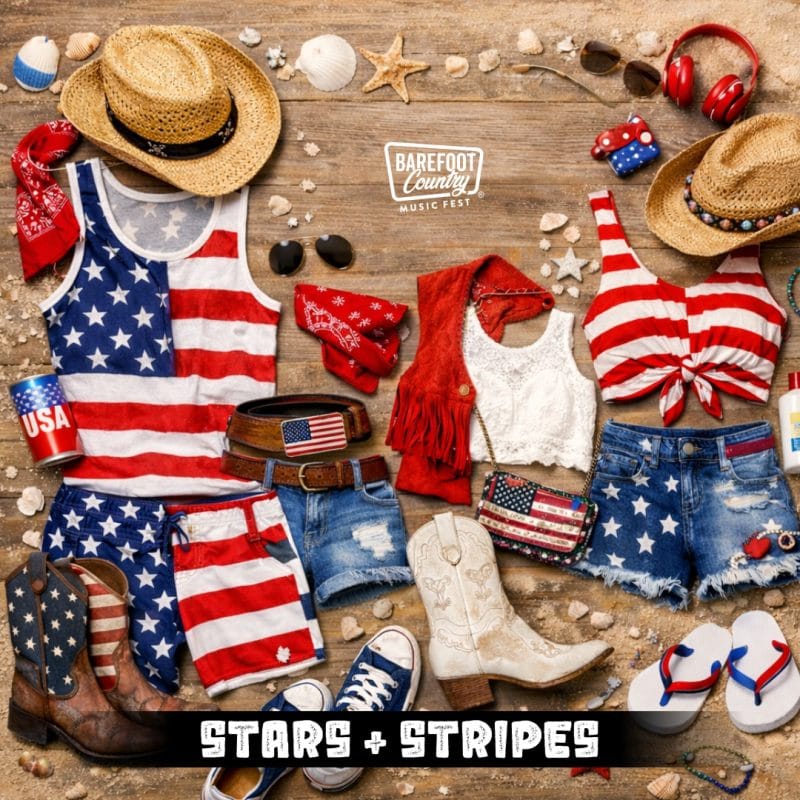 The Guys’ Look: Classic Americana never misses. Pearl-snap shirts in red or blue plaid, vintage flag tees, or bold stars-and-stripes button-ups all work. Keep it effortless but loud. American flag hats, bandanas, or wrist wraps help beat the heat while locking in the look. Cowboy boots or work boots are the finishing touch — worn in, broken in, and ready for a full night on the sand.